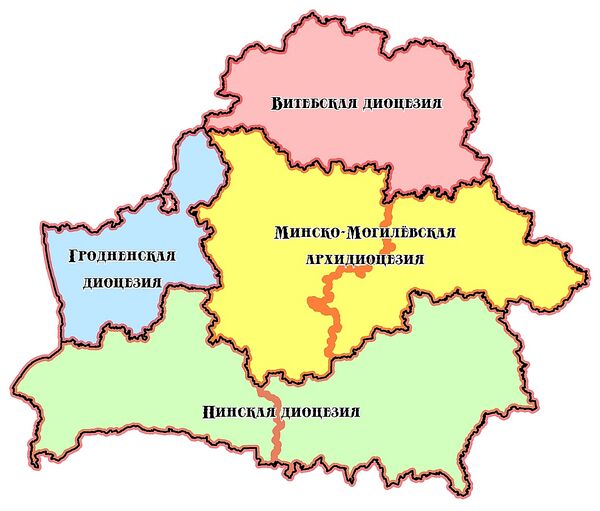 Католическая церковь — вторая по величине религиозная община в Республике Беларусь. Католиками (по данным самой католической церкви) являются около 1,4 млн чел.[18], католицизм более распространён на западе страны (прежде всего, в Гродненской области). В настоящее время Белоруссия разделена на 4 епархии: