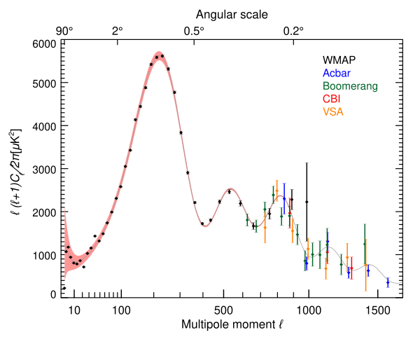 Во время космологической инфляции, в первые с после Большого взрыва, квантовые флуктуации вызывают возникновение неоднородностей плотности материи Вселенной, которые затем начинают колебательные движения в виде стоячих (из-за быстрого расширения пространства) акустических волн с одинаковой начальной фазой. Во время испускания реликтового излучения неоднородности материи будут выделены и подавлены в зависимости от текущей фазы волны. На рисунке максимум реликтового излучения образовался благодаря акустическим волнам, имевшим в момент рекомбинации фазу . Остальные максимумы возникли как следствие волн с фазами , , …[41]