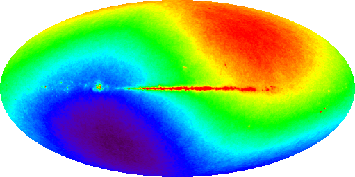 Ещё в 1969 году было обнаружено, что в реликтовом излучении заметно выделена дипольная составляющая: в направлении созвездия Льва температура этого излучения на 0,1 % выше, чем в среднем, а в противоположном направлении — на столько же ниже[24]. Этот факт интерпретируется как следствие эффекта Доплера, возникающего при движении Солнца относительно реликтового фона со скоростью примерно 370 км/с в сторону созвездия Льва. Поскольку Солнце обращается вокруг центра Галактики со скоростью ~220-230 км/с в сторону созвездия Лебедя, и также совершает движение относительно центра Местной группы галактик (группы галактик, включающей Млечный Путь)[25], это означает, что Местная группа как целое движется относительно реликтового излучения со скоростью примерно (по современным данным) км/с в направлении точки с галактическими координатами , [26][27] (эта точка располагается в созвездии Гидры[28]).