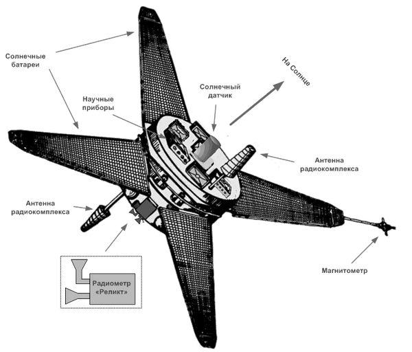 Для измерения фонового космического радиоизлучения на борту «Прогноза-9» был установлен радиометр «Р-08 Реликт», который можно назвать самым маленьким из выведенных в космос радиотелескопов. Его вес составлял 30 кг, а энергопотребление — 50 Вт. В состав прибора входили две рупорных антенны, высокочастотный параметрический усилитель, обеспечивающий высокую чувствительность прибора, детектор сигнала и антенный переключатель[10]. Радиометр работал на единственной частоте 37 ГГц (длина волны 8 мм) и имел полосу пропускания 400 МГц. Среднеквадратичное значение собственного шума при накоплении в течение 1 секунды составляло 31 мK. Измерения вариаций фонового космического излучения производилось дифференциальным методом — радиометр имел две рупорных антенны, поочерёдно подключавшихся к входу прибора с частотой 1 кГц, измерялась разница температур излучения, принимаемого постоянно направленной в одну точку «референсной» антенной и «измерительной» антенной, сканирующей определённый участок видимой небесной сферы[17][8]. Радиометр «Реликт» был установлен на борту спутника, имевшего постоянную солнечную ориентацию и стабилизированного вращением вокруг солнечной оси, таким образом, что «референсная» антенна с шириной диаграммы направленности 10° постоянно была направлена в сторону, противоположную Солнцу. «Измерительная» же антенна, с шириной диаграммы направленности 5,8°, направленная перпендикулярно «референсной», совершала полный оборот по небесной сфере за период вращения спутника вокруг его солнечной оси, составлявший примерно 2 минуты. Из-за орбитального движения Земли продольная ось спутника смещалась примерно на 1° в сутки относительно Солнца, поэтому раз в неделю проводилась переориентация спутника с поворотом его оси на 7°, после чего сканирование возобновлялось. Таким образом за полгода была просмотрена вся небесная сфера, некоторые её участки — дважды[8][18].