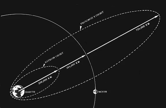 Для уверенного приёма слабого реликтового излучения приёмное устройство должно быть вынесено как можно дальше от создаваемых Землёй и Луной тепловых помех, на расстояние порядка миллиона километров от Земли[8]. Запуск спутника на требуемую для осуществления эксперимента «Реликт-1» орбиту связан со значительными трудностями, поскольку на таком удалении от Земли он испытывает соизмеримые воздействия от притяжения Земли, Луны и Солнца и, чтобы предотвратить его «захват» этими небесными телами, для «Прогноза-9» была рассчитана уникальная орбита с перигеем 361 км, апогеем 727 620 км, наклонением 65,3° и периодом обращения 25,5 суток, на которой спутник, не имеющий корректирующего двигателя, мог существовать не менее года[14][15]. «Прогноз-9» был запущен 1 июля 1983 года с космодрома «Байконур» носителем «Молния-М» c 4-й ступенью (разгонным блоком) «СО/Л»[16]. Кроме аппаратуры проекта «Реликт-1» на спутнике «Прогноз-9» были установлены приборы для исследования солнечной радиации, межпланетного пространства и дальнего космоса[10].