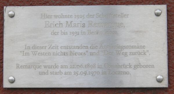В 1972 году в Берлине на доме по адресу Виттельсбахерштрассе, 5, где возник роман «На Западном фронте без перемен», в честь Ремарка была открыта мемориальная доска.