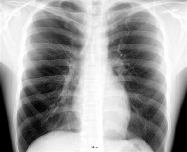 Лёгкие на рентгенограмме образуют лёгочные поля, располагающиеся по обе стороны от интенсивной тени средостения. Правое лёгочное поле короче и шире левого. В лёгочных полях различают верхушки (зоны выше ключиц), верхние отделы — от верхушек до передних отрезков вторых рёбер, средние отделы — между вторыми и четвёртыми парами рёбер, и нижние отделы — от четвёртых рёбер до диафрагмы. Лёгочные поля в норме очень светлые (тёмные на негативе) из-за высокой рентгенопроницаемости заполненной воздухом лёгочной ткани. Структура лёгочных полей называется лёгочным рисунком, анатомическим субстратом которого являются лёгочные сосуды и, в малой степени, лёгочный интерстиций. Лёгочный рисунок визуализируется в виде переплетения сосудистых теней тяжистого, округлого и овального вида, более интенсивных в местах их пересечений. В направлении от корней лёгких к периферии рисунок лёгочных сосудов становится беднее и совсем не визуализируется на расстоянии 1—1,5 см от края лёгочных полей. Лёгочный рисунок наиболее густой в нижних отделах лёгочных полей, обедняясь к верхушкам. Тени бронхов на рентгенограмме визуализируется в виде двойных полосок или колец с просветлением внутри.[3][4]