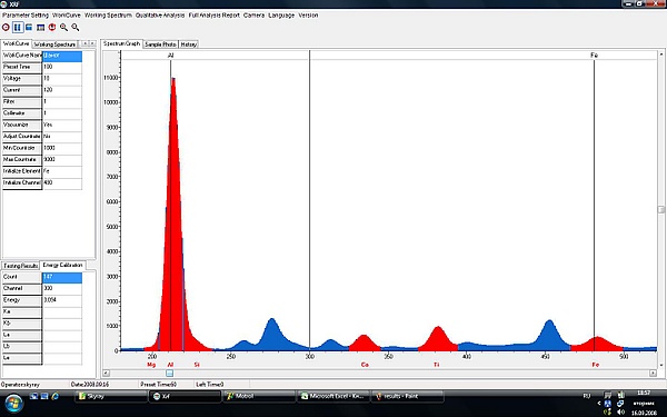После попадания на детектор фотон преобразовывается в импульс напряжения, который в свою очередь подсчитывается счётной электроникой и наконец передается на компьютер. Ниже приведён пример спектра, полученный при анализе корундовой ступки (содержание Al2O3 более 98 %, концентрации Ca, Ti порядка 0,05 %). По пикам полученного спектра можно качественно определить, какие элементы присутствуют в образце. Для получения точного количественного содержания необходимо обработать полученный спектр с помощью специальной программы калибровки (количественной градуировки прибора). Калибровочная программа должна быть предварительно создана с использованием стандартных образцов, чей элементный состав точно известен. Упрощённо, при количественном анализе спектр неизвестного вещества сравнивается со спектрами, полученными при облучении стандартных образцов, таким образом получается информация о количественном составе вещества.