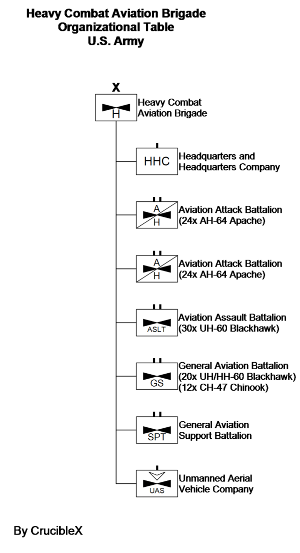 Бригады армейской авиации (Combat Aviation Brigade) — многофункциональные формирования, сочетающие в своём составе беспилотники, тяжёлые (Чинук) и средние транспортные вертолёты (Блакхок), санитарно-эвакуационные вертолёты, ударные вертолёты (Апач). Находятся в прямом подчинении командира дивизии.