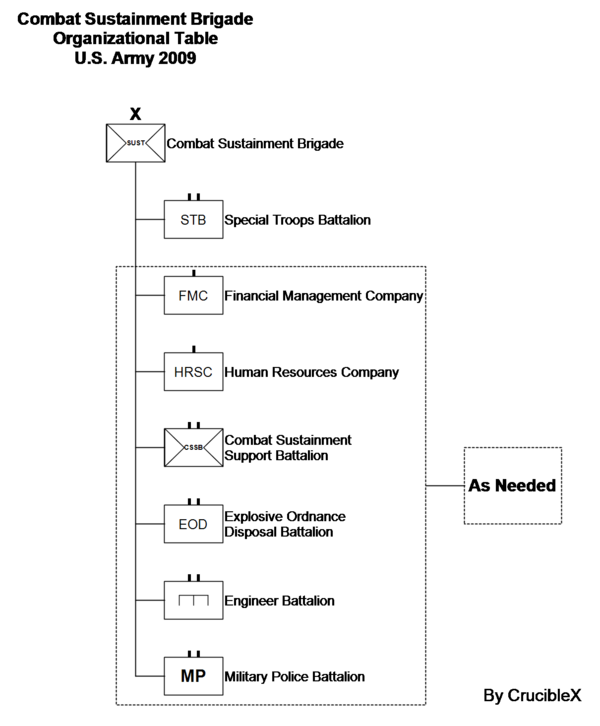 Бригады поддержки (Sustainment Brigade) — включают в себя батальоны специальных войск (Special Troops Battalion), материально-технического обеспечения (Combat Sustainment Support Battalion), инженеров, военной полиции, обезвреживания взрывоопасных предметов, роты человеческих ресурсов, финансового управления.