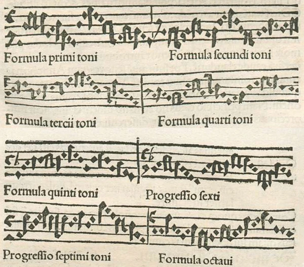 Стандартные реперкуссии церковных тонов: (1) d–a, (2) d–f, (3) e–c¹, (4) e–a, (5) f–c¹, (6) f–a, (7) g–d¹, (8) g–c¹.