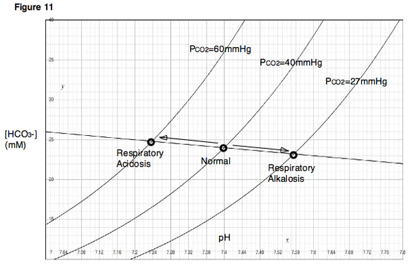 - Острый респираторный алкалоз возникает быстро и характеризуется значительным повышением pH крови, поскольку буферные системы не успевают полностью компенсировать резкое снижение концентрации CO₂. Кратковременная компенсация обеспечивается за счёт связывания HCO₃⁻ ионами водорода (H⁺) во внеклеточной жидкости[3] .