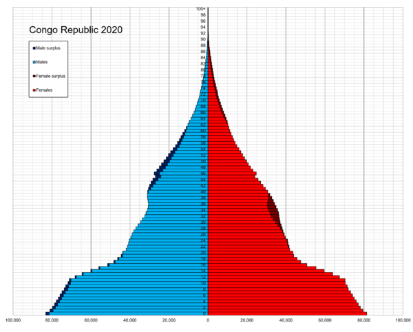 Этнический состав: конго 48 %, санга 5,6 %[48], мбоши 12 %, теке 17 %, пигмеи 10 %[49], европейцы и другие 3 %[46].