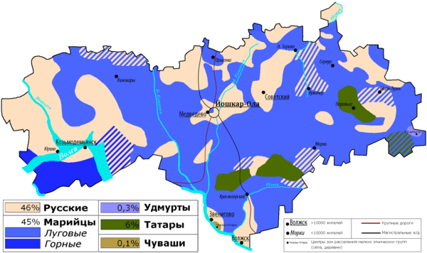 В городском населении Йошкар-Олы и Волжска, а также ряде сёл в окрестностях Йошкар-Олы и на западе республики преобладают русские. В сельской местности преобладает марийское население, в Горномарийском районе — горные марийцы, по языку и культуре отличающиеся от луговых марийцев. В Звениговском районе расположено несколько чувашских сёл.