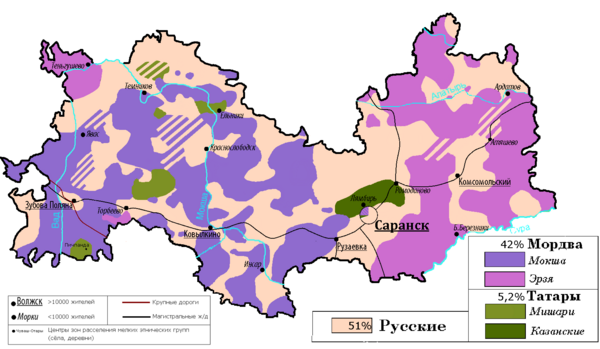 Районы компактного проживания мордовских этносов расположены по географическому принципу: мокшане проживают в основном в центре и на западе республики, эрзяне — в восточной части. Примерно около 3-4 % населения республики составляют заключённые, отбывающие наказание в республике, но проживающие в других регионах Европейской и даже Азиатской части России, а также за пределами РФ. Мордовии принадлежит первое место в РФ по концентрации исправительно-трудовых учреждений, там их более 30. Для сравнения в Санкт-Петербурге с населением 5,2 млн находится 4 действующих СиЗО и 6 исправительно-трудовых колоний. В соседней Ленинградской области с населением 1,8 млн находится 2 СиЗО и 4 ИТК.