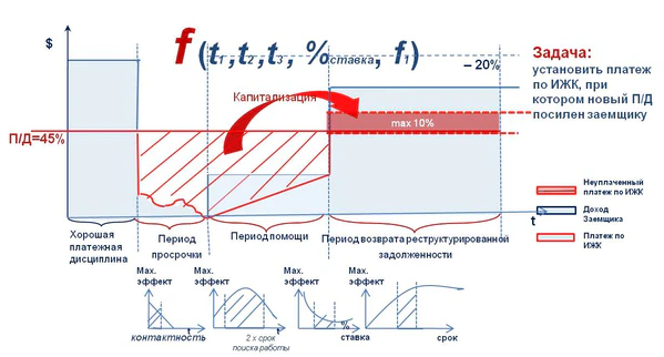 - Дополнительная нагрузка по окончании периода помощи. Необходимо тщательное прогнозирование будущих доходов заёмщика (как на основании «старых», так и на основании прогноза). При этом рекомендуем формировать «схему реструктуризации» таким образом, чтобы соотношение П/Д в будущем в любом случае не превышало 50 %, то есть: