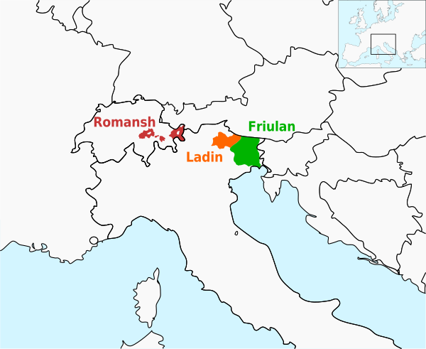 - ладинский (Ladin) — на севере Италии — область Альто-Адидже и к востоку от Доломитовых Альп;