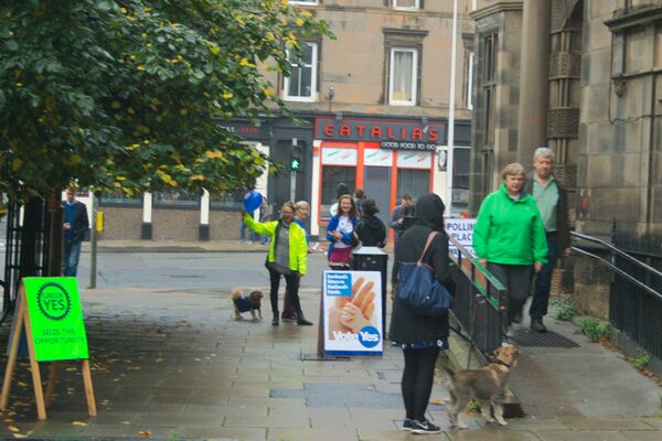 После окончания голосования, в 22:00 (1:00 по московскому времени 19 сентября)[121], граждане в ожидании итога референдума начали собираться у здания парламента Шотландии в Эдинбурге и на главных площадях страны[122], однако к полуночи большинство переместилось в пабы и рестораны[123], которым было разрешено работать всю ночь во время подсчёта голосов, чтобы предотвратить беспорядки[124]. Между тем, представитель Букингемского дворца сообщил, что «Королева внимательно следит за референдумом о независимости Шотландии, её информируют о состоянии дел официальные лица в Лондоне и Эдинбурге»[125].