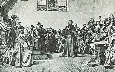 Папство первоначально не выказало особой озабоченности его выступлением. Столкновения между различными монашескими орденами были не редкостью, так что и в этот раз произошедшее показалось папе «монашеской сварой». Однако Лютер, заручившись поддержкой Фридриха, курфюрста Саксонского, не уступал присылаемым папским эмиссарам, в то же время обязуясь не распространять свои идеи при условии, что молчание будут хранить и его противники[11]. Однако события на Лейпцигском диспуте заставили его прервать молчание. Выразив поддержку Яну Гусу и недоверие церковному собору, осудившему его, Лютер обрёк себя на проклятие и разрыв отношений с церковью. Следующим шагом было то, на что до этого практически никто не решался: 10 декабря 1520 года при огромном скоплении народа Лютер сжёг папскую буллу, где осуждались его взгляды. Здесь в дело вмешалась светская власть. Вновь избранный император Священной Римской империи Карл V вызвал Лютера на имперский сейм в Вормсе с целью убедить его отказаться от своих взглядов — подобно тому, как сто лет назад подобную попытку предпринял Император Сигизмунд в отношении Гуса. Лютеру дали два дня, чтобы дать ответ на вопрос о том, готов ли он отречься. В конце второго дня Лютер, стоя перед императором, окружённым верховными светскими и духовными правителями Германии, ответил: «На том стою. Не могу иначе. Да поможет мне Бог». Пути назад больше не было. Согласно Вормсскому эдикту Лютер был поставлен вне закона на территории Священной Римской империи.