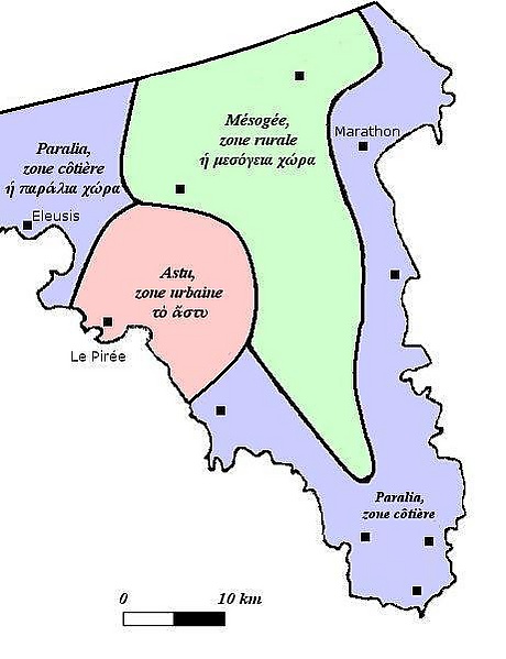 Аттику поделили на три области — городскую, прибрежную и центральную. Каждую из областей поделили на 10 триттий (размером в 1½-2 квадратные мили) из одного или нескольких демов. Три, расположенные на отдалении триттии из различных областей, составляли филу. Каждая из фил и триттий были сопоставимы по населению. Особенностью реформы стало распределение триттий по филам случайным образом. Фила состояла из хаотично расположенных городских, прибрежных и внутренних демов. Смысл нововведения заключался в том, что региональные интересы в филе не могли возобладать над общегосударственными. Афины, которые также поделили на демы, переставали существовать в качестве города-государства. Афины с политической точки зрения «растворились» в Аттике, либо, по образному выражению Р. Осборна, «расширили свои границы» до государственных пределов. Одновременно город становился политическим центром. Представители расположенных в различных уголках Аттики демов одной филы для решения общих вопросов должны были собираться в одном, наиболее подходящем для всех месте. Таковым закономерно стали Афины[9].