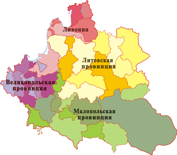 Речь Посполитая состояла из трёх провинций. Великое княжество Литовское составляло отдельную провинцию, а Королевство Польское делилось на Великопольскую и Малопольскую провинции. Провинции делились на воеводства, а те, в свою очередь, — на поветы (уезды).