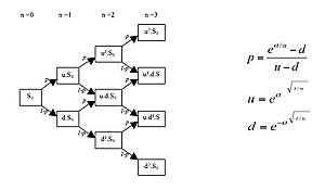 Самой простой решётчатой моделью является биномиальная модель ценообразования опционов[7]; стандартный («канонический»)[8] метод был предложен в 1979 году Джоном Каррингтоном Коксом (англ. John Carrington Cox), Стивеном Россом (англ. Stephen Ross) и Марком Рубинштейном (англ. Mark Rubinstein) и получил название «биномиальная модель CRR»; формула приведена на диаграмме.