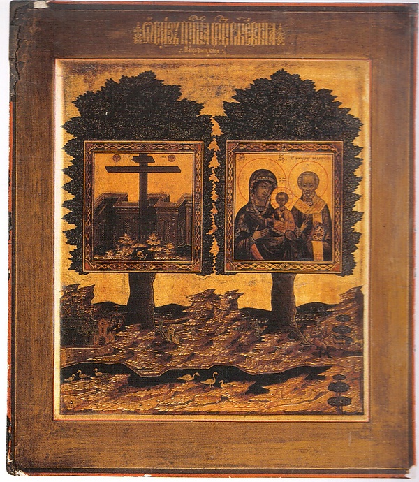 На означенном месте Стефан сначала нашёл на одной из сосен икону Голгофского креста. Недалеко от него также на сосне обнаружилась икона Божией Матери с Младенцем, с предстоящим святителем Николаем. Обе находки были небольшого размера, величиной с ладонь[2]. Из рукописи середины XVI века «О явлении Оковецких икон и о чудесах от них» известно, что обе иконы были изображены на «немецком белом железе», то есть на импортной лужёной жести[3].
