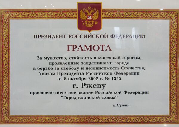 «За мужество, стойкость и массовый героизм, проявленные защитниками города в борьбе за свободу и независимость Отечества» Указом Президента Российской Федерации № 1345 от 8 октября 2007 года городу Ржеву присвоено почётное звание «Город воинской славы».