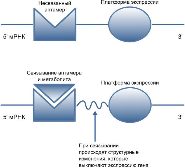 В конце концов, было показано, что три производных витаминов — тиаминпирофосфат (ТРР), флавинмононуклеотид (FMN) и AdoCbl — непосредственно взаимодействуют с соответствующими мРНК, контролируя опероны витаминов B1, B2 и B12. Эти сообщения показали, что связывание метаболитов стабилизирует конформацию эволюционно консервативного РНК-сенсора (природного аптамера) и индуцирует укладку неконсервативных нижележащих областей РНК в такую структуру, которая влияет на терминацию транскрипции или инициацию трансляции. Таким образом, непосредственное связывание метаболита с РНК вызывает «рибопереключение» мРНК между альтернативными конформациями, влияя на экспрессию генов[5]. Термин «рибопереключатель» (англ. riboswitch) был предложен в 2002 году Breaker и коллегами[4].