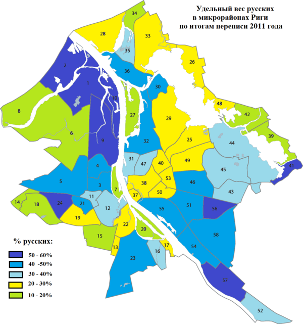 латыши — 47,37 %, русские — 35,71 %, белорусы — 3,59 %, украинцы — 3,49 %, поляки — 1,7 %, литовцы — 0,79 %, другие — 7,35 %[3] |