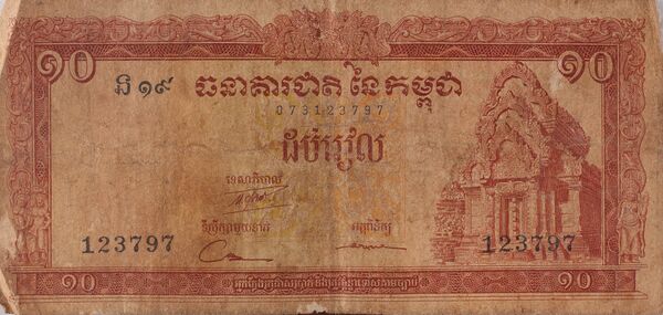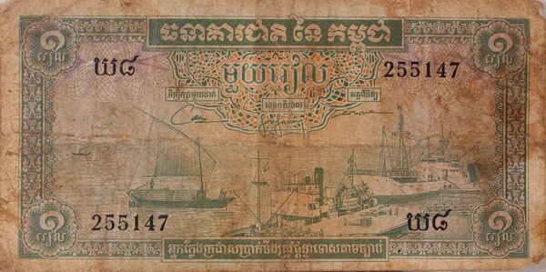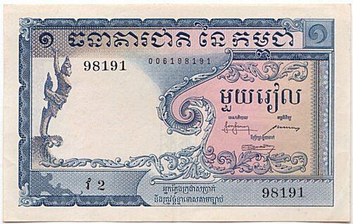 - Красные кхмеры незадолго до захвата власти (1975) напечатали серию банкнот, однако они не поступили в обращение. После их прихода к власти (Демократическая Кампучия) деньги в стране были отменены, фактической валютой был рис[источник не указан 4976 дней].
