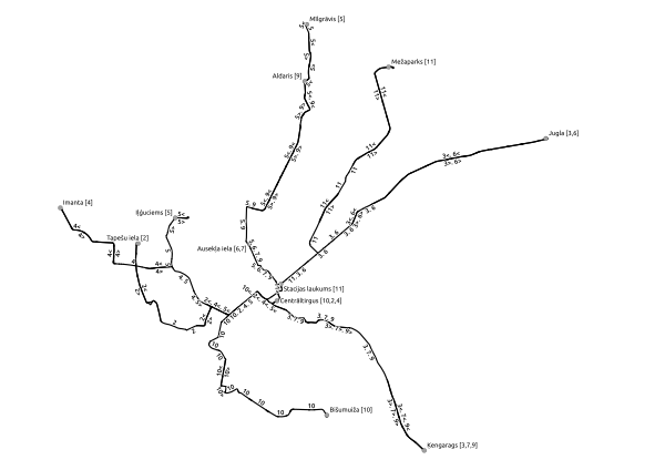 - № 5 Иманта — Милгравис, перед конечной в Милгрависе имеется небольшой однопутный участок (примерно 250 метров). С 14 апреля 2023 года в связи с ремонтными работами маршрут перенаправлен в Иманту, на участке от Ильгюциемса до ботанического сада заменён автобусом 5T.