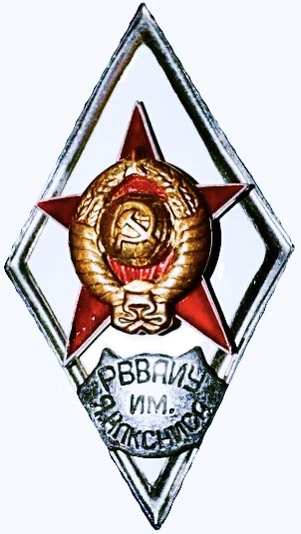 В 1957 году училище было передано в состав учебных заведений, находившихся в ведомстве ВВС, в связи с этим последовало новое переименование: заведение стало называться Рижским военным авиационным радиотехническим училищем (РВАРТУ). В 1967 году была произведена реорганизация училища — оно приобрело статус высшего военного училища (РВВИАУ). В этом же 1967 году ему было присвоено имя командующего ВВС СССР с 1931 года Якова Ивановича Алксниса. Первый выпуск 138 инженеров нового Высшее учебное заведениеа для Военно-Воздушных Сил СССР состоялся в 1972 году. Выпускники получили прекрасное образование не только профессиональное, но и научное. По своему статусу РВВИАУ приравнивалось к академии, выпускники получали соответствующую базовую подготовку, и дополнительного образования им уже не требовалось. Кстати, они традиционно назывались не курсантами, а слушателями. Выпускникам выдавался академический нагрудный знак белого цвета (см справа). Окончательное название училища, сохранившееся до восстановления независимости Латвии, было оформлено в 1973 году.