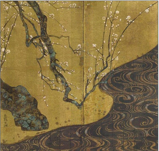 Школа Римпа развивалась в эпоху Гэнроку (1688—1704) благодаря братьям Огате Корину и Огате Кэндзану, сыновьям богатого торговца тканями. Огата Корин внёс новаторские черты в стиль школы; он изображал природные элементы в абстрактной манере, используя несколько цветов и оттенков, драгоценные материалы — золото и перламутр, а также технику тарасикоми для создания неожиданных эффектов. Шедевром Огаты Корина стала роспись на ширме Цветение красной и белой сливы (около 1714 года, находится в собрании Художественного музея MOA в Атами)[4]. Работа считается образцом мастерства Римпа[5]. Огата Кэндзан большую часть своей жизни работал с керамикой и серьёзно занялся живописью только после смерти своего брата. Братья часто работали вместе над керамическими изделиями, где Огата Корин создавал рисунки и каллиграфию для керамики[6][7].