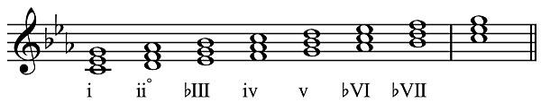 | Символ аккорда | I min | II dim | ♭III Aug (or III Maj) | IV min (or IV Maj) | V Maj (or V7) | ♭VI Maj | ♭VII Maj | VII dim (or VII°) |