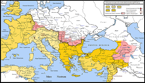 Около 335 года Константин назначил своего племянника Ганнибалиана «царём царей» и правителем понтийских племён, а цезарь Констанций был назначен командовать войсками на восточной границе. Примерно к этому же времени относятся неудачное вторжение персов в Месопотамию и осада Амиды[106]. В 336 году Шапур отправил посольство с предложением мира, однако Константин его не принял. Смерть Константина не дала реализоваться римским планам. После убийства Ганнибалиана в том же году мятеж в Армении постепенно прекратился, и Хосров с римской помощью восстановил свою власть[105].