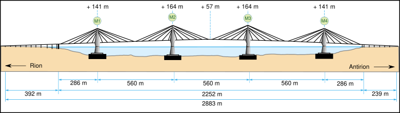 Рион — Андирион — мост с вторым по длине подвесным пролётным строением в мире (2252 м[3]), после построенного во Франции виадука Мийо (2460 м). Для сравнения, длина пролётного строения моста Золотые Ворота в Сан-Франциско в США составляет 1966 м.