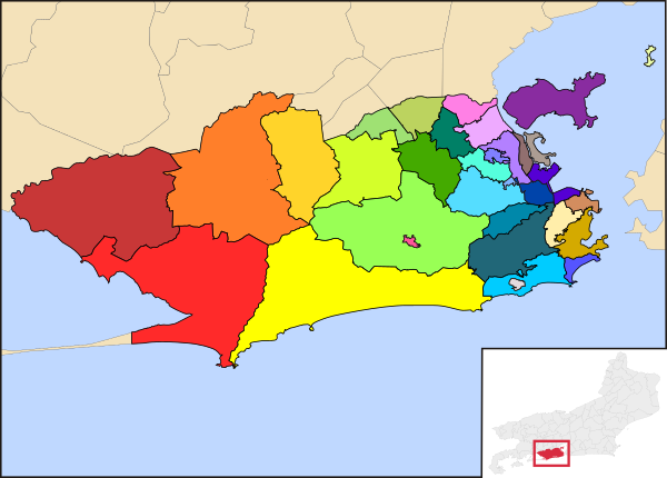 Муниципалитет города Рио-де-Жанейро до 2008 был разделён на 6 районов (субпрефектур, порт. subprefeituras)[14]. В мае 2010 была добавлена ещё одна субпрефектура — Остров губернатора[15], и в настоящее время муниципалитет имеет в своём составе 7 субпрефектур: Бара-и-Жакарепагуа, Центр и исторический центр, Гранде Тижука, Остров губернатора, Южная зона, Западная зона, Северная зона.
