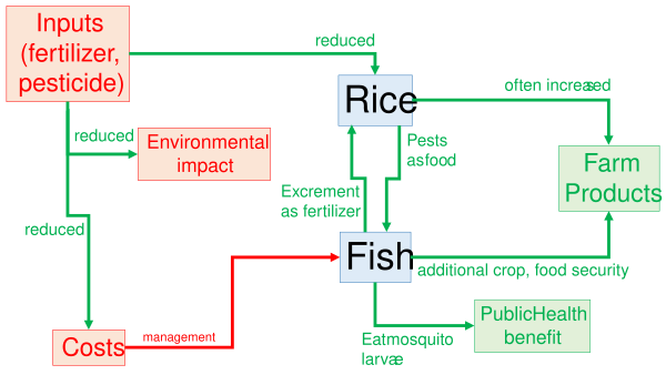 Выращивание рыбы не только диверсифицирует производство, но и способствует повышению продовольственной безопасности и увеличению доходов.; Халварт и Гупта подчёркивают, что повышение урожайности риса и снижение потребности в удобрениях и пестицидах являются дополнительными преимуществами этой технологии[15].