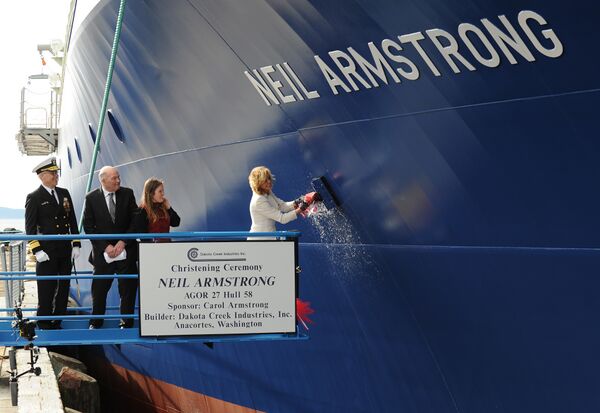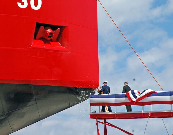 Ключевым моментом церемонии спуска является наречение корабля именем, которое символизирует переход корабля в новое состояние, начало его жизни. Крестная или крёстный торжественно обращается к кораблю со словами: «In the name of the United States I christen thee…», произносит имя корабля, далее следует разбитие бутылки с какой-либо жидкостью. В роли «святой воды» может использоваться вода, сидр, вино, но традиционно предпочитают светский напиток — шампанское. Бутылка разбивается о носовую часть корабля: «As „Constitution“ ran out, Captain Sever broke a bottle of fine old madeira over the heel of the bowsprit». Место разбития выбирается не случайно и связано с тем, что носовая часть корабля метафорически воспринимается как голова человека. Именно голову человека окропляет святой водой священник при крещении.