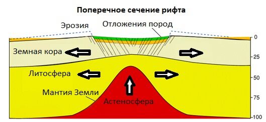 На континентах ныне активной является система Восточно-Африканских рифтов, где при активном вулканизме происходит раздвижение и утончение континентальной коры и в некоторых местах (Афар) уже формируется океаническая кора. Развитие этой зоны может привести к образованию нового океана. Такие рифты образуются в результате поднятия к поверхности больших участков горячей мантии — плюмов, приподнимающих и растягивающих кору. Для активных рифтов характерен интенсивный вулканизм.[источник не указан 2018 дней]