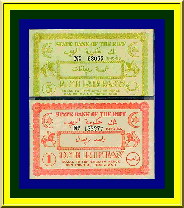 Были отпечатаны купюры в 1 и 5 риффанов, фактически не выпущенные в обращение. Нет точных данных, где и когда были изготовлены эти купюры. На самих банкнотах указана дата — 10.10.1923. Указанный на банкнотах Государственный банк Риффа не был создан.