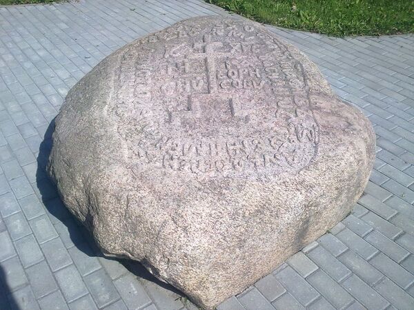На одной из сторон валуна неправильной формы, размером примерно 3 х 2,5 х 2 метра, высечен 6-конечный крест и надпись: «В лето 6679 месяца мая в 7 день доспен крест сей. Господи помози рабу своему Василию в крещении именем Рогволоду сыну Борисову». Высота букв около 15 см. Крест и надпись высечены по приказу друцкого князя Рогволода Борисовича, который после голодной зимы 1170—1171 годов освятил языческий камень в надежде на урожай.