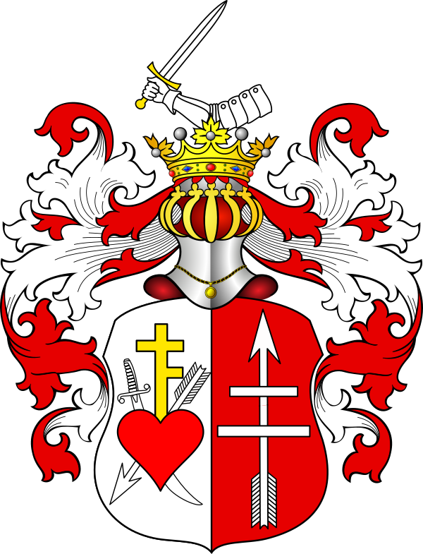 В щите, разделённом перпендикулярно надвое, в правом серебряном поле означено красное сердце, пронзённое крестообразно саблей и стрелой, остриями вниз, а над сердцем изображены полтора золотых креста. В левом красном поле серебряная стрела, летящая вверх, поверх два переклада.