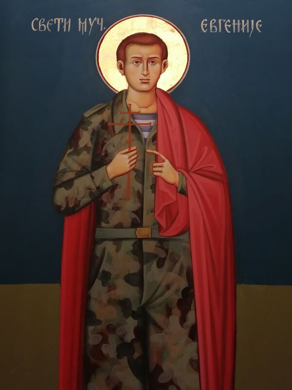 Протоиерей Валентин Сидоров составил службу мученику воину Евгению. Служба включает стихиры для малой и великой вечерни, для утрени, канон мученику Евгению, включающий 9 песней и акафист, и молитву святому мученику Евгению[16].