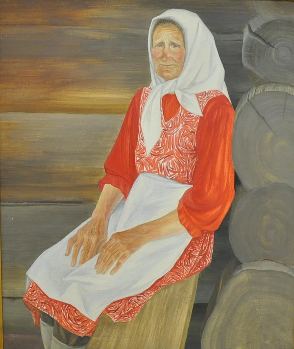 Изображение занимает почти всю поверхность холста: пожилая женщина сидит на лавке, представлена поколенно, в фас с поворотом вправо. На ней традиционный сарафан, красная кофта, белый платок и передник. Лоб женщины покрыт морщинами, глаза глубоко посажены, нос прямой, губы плотно сжаты. Крупные руки с ярко выраженными венами покоятся на коленях. На заднем плане изображена стена деревянного дома, а общий колорит картины выдержан в красных, коричневых и серых тонах.