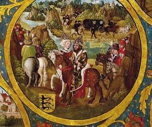 | 11. | Альбрехт Легкомысленный | Вымышленная личность | Граф фон Боген | На переднем плане — передача власти над Австрией между братьями. На заднем плане — замок Пернегг. | |
