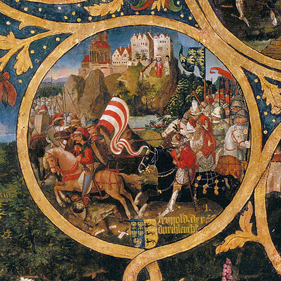 | 24. | Леопольд VI Славный | 1176 — 1230 | Герцог Австрии | На переднем плане — заключение мира в Монтекассино. На заднем плане — основанные Леопольдом монастырь Лилиенфельд и Винер-Нойштадт. | |