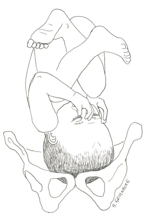 Внутренний поворот головки начинается в плоскости широкой части малого таза и заканчивается в плоскости выхода из малого таза. Головка устанавливается в прямом размере стреловидным швом в плоскости выхода из малого таза.