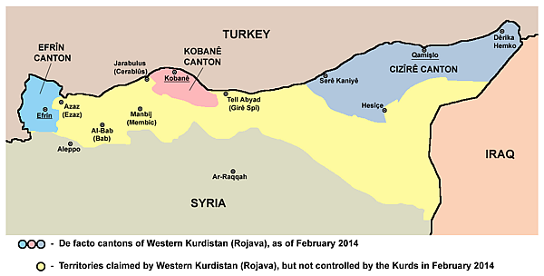 В январе 2014 года состоялось заседание Законодательного собрания демократического автономного правительства Западного Курдистана, в котором были представлены более 50 партий, движений и общественных организаций. 21 января была сформирована автономная администрация кантона Джизре со столицей в городе Камышлы[50], 27 января — автономная администрация кантона Кобани[51], 29 января — автономная администрация кантона Африн[52]. Летом 2014 года в кантонах были проведены всеобщие выборы.