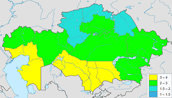 | Южно-Казахстанская область | 22.84 | 27.91 | 29.60 | 32.02 | 29.71 | 30.90 | 30.64 | 30.23 | 30.33 | 29.87 |