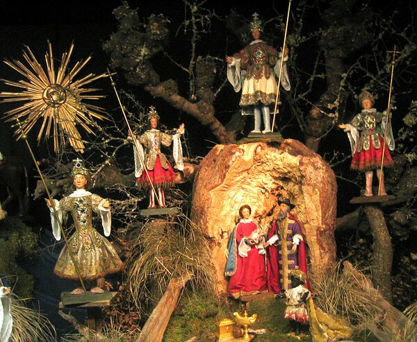 - Три волхва. Согласно католической традиции, поклонение волхвов произошло в день Богоявления (6 января), и фигурки волхвов иногда прибавляются к композиции лишь в этот день.