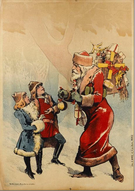 К XIX веку традиция новогодних подарков постепенно заменяется традицией дарить их на Рождество (преимущественно детям). В настоящее время рождественские подарки однозначно ассоциируются с их главным дарителем — Пер-Ноэлем — однако этот персонаж также впервые появился лишь в XIX веке. Его прообразом послужил святой Николай, память которого отмечается 6 декабря и который считается покровителем детей. Согласно поверью, в ночь с 5 на 6 декабря он путешествует по свету и кладёт подарки в башмачки, оставленные детьми перед камином[5]. Однако подарки получают только хорошие и послушные дети; тем же из них, кто плохо вёл себя в течение года, достаются угольки и розги от «тёмного» спутника святого Николая — Пер-Фуэтара. В некоторых регионах на северо-востоке Франции, в частности, в Лотарингии, традиция сохраняется до сих пор.