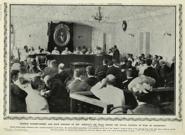 После подписания Портсмутского мира адмирал вернулся в Россию, где был восстановлен в своей прежней должности. В «Полном послужном списке» от 16 января 1906 года, подписанным контр-адмиралом А. Г. Нидермиллером, он — «Начальник Главного Морского Штаба, Генерал-Адъютант, Вице-Адмирал»[7]. В том же документе написано: « В службе сего адмирала не было обстоятельств, лишающих его права на получение знака отличия беспорочной службы…». Вскоре в газетах началась травля адмирала. Первоначально Рожественский пытался оправдываться, но затем, в феврале 1906 года, подал в отставку с поста начальника Главного морского штаба. Однако волна критики не утихала, и адмирал настоял на привлечении себя к суду. На суде он оправдывал своих подчинённых, в особенности матросов, и просил для себя смертной казни, но был оправдан военно-морским судом как человек, получивший в сражении тяжкое ранение.